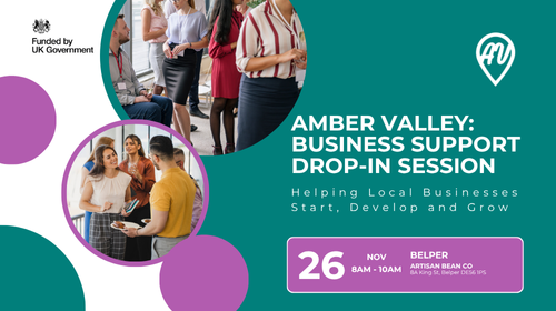 Amber Valley Business Drop-In - Belper - 26 Nov 2025, 08:00am - 10:00am.Join Amber Valley Borough Council’s Economic Development Team and partners from East Midlands Chamber, Derbyshire Start-up and Department for Work & Pensions for a Business Drop-In Session – a chance to get advice, explore opportunities, and connect with other local businesses. No booking needed. For more information visit Business Drop-In Session | Facebook |