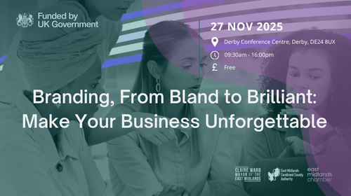 Branding, From Bland to Brilliant: Make Your Business Unforgettable - 27 Nov 2025, 9:30am - 16:00pm.In a noisy market, blending in means being overlooked. This practical, hands-on workshop helps small business owners and marketing teams transform their business from forgettable to irresistible. You’ll discover how to define a clear, authentic brand, position yourself confidently in your market, and tell your story in a way that connects with the right audience. For more information or to book a place visit Branding, From Bland to Brilliant: Make Your Business Unforgettable - East Midlands Chamber |
