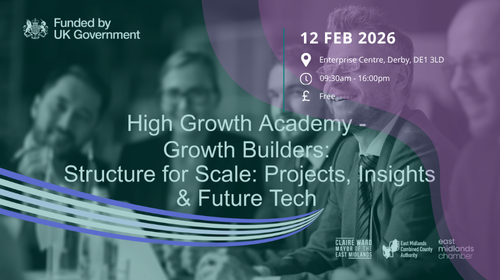 Growth Builders: Structure for Scale: Projects, Insights & Future Tech - 12 Feb 2026, 9:30am - 16:00pm.This workshop will explore proven methodologies to lead complex projects with confidence, balance scope and risk, align with stakeholder priorities, and leverage technology to drive strategic impact. This contemporary session will help you to assess the benefits and challenges of technical innovations that could help you to scale your organisation effectively. You will be able to review these options from a strategic perspective, balancing risk and opportunity. For more information or to book a place visit High Growth Academy - Growth Builders: Structure for Scale: Projects, Insights & Future Tech - East Midlands Chamber |