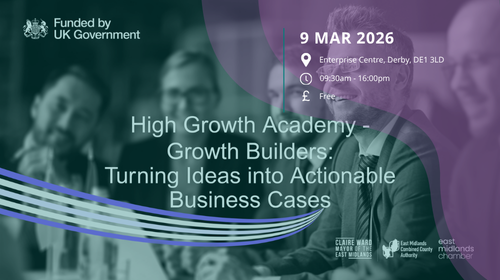 Growth Builders: Turning Ideas into Actionable Business Cases - 9 Mar 2026, 9:30am - 16:00pm.Effectively managing the challenges of change is vital to successful growth. This workshop will equip you with tools to manage change effectively, helping you to recognise the drivers of change, how these affect stakeholders differently and what you can do to achieve a successful outcome for your business. For more information or to book a place visit High Growth Academy - Growth Builders: Turning Ideas into Actionable Business Cases - East Midlands Chamber |