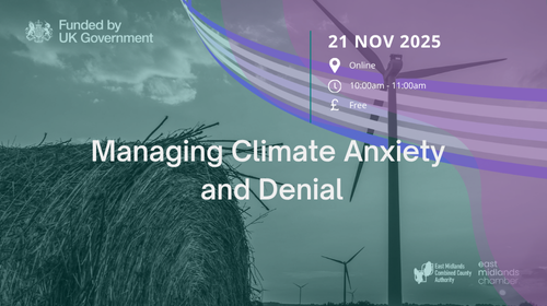 Managing Climate Anxiety and Denial - 21 Nov 2025, 10:00am - 11:00am.Following on from the optional ‘Decarbonising Culture and Optimising Engagement’ webinar, this workshop focuses solely on how to identify those employee mindsets that might be blockers to achieving your sustainability goals. It will provide you with a clear understanding of the varying viewpoints within your team and share practical steps to provide immediate positive outcomes and ring them on the journey with you. For more information or to book a place visit Managing Climate Anxiety and Denial - East Midlands Chamber |